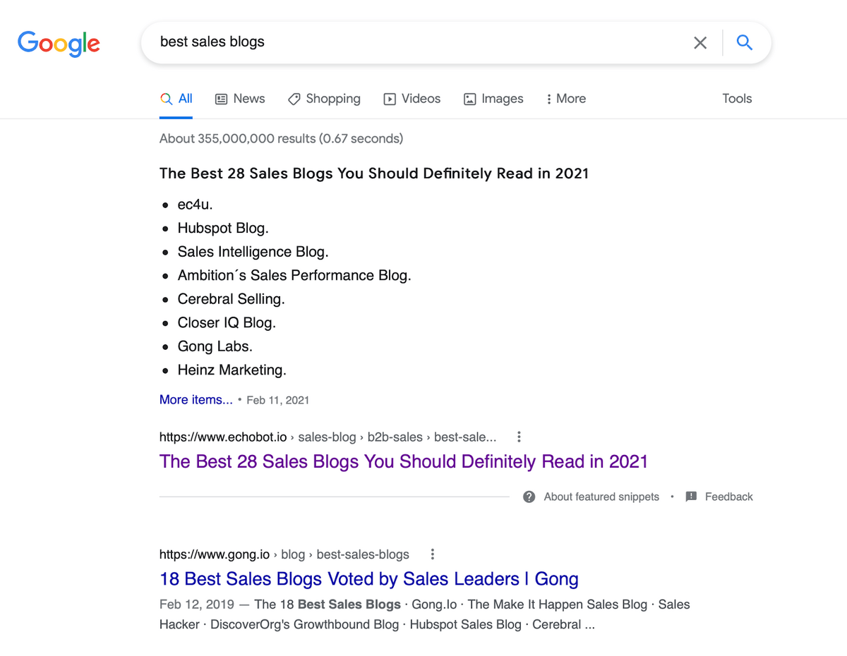 One of my clients, for example, is in the sales niche, so for their campaign, I searched for “best sales blogs.”