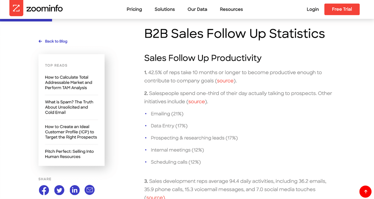 They also have another article on Sales Email vs. Cold Calling, where they list a bunch of statistics — all with outbound links.