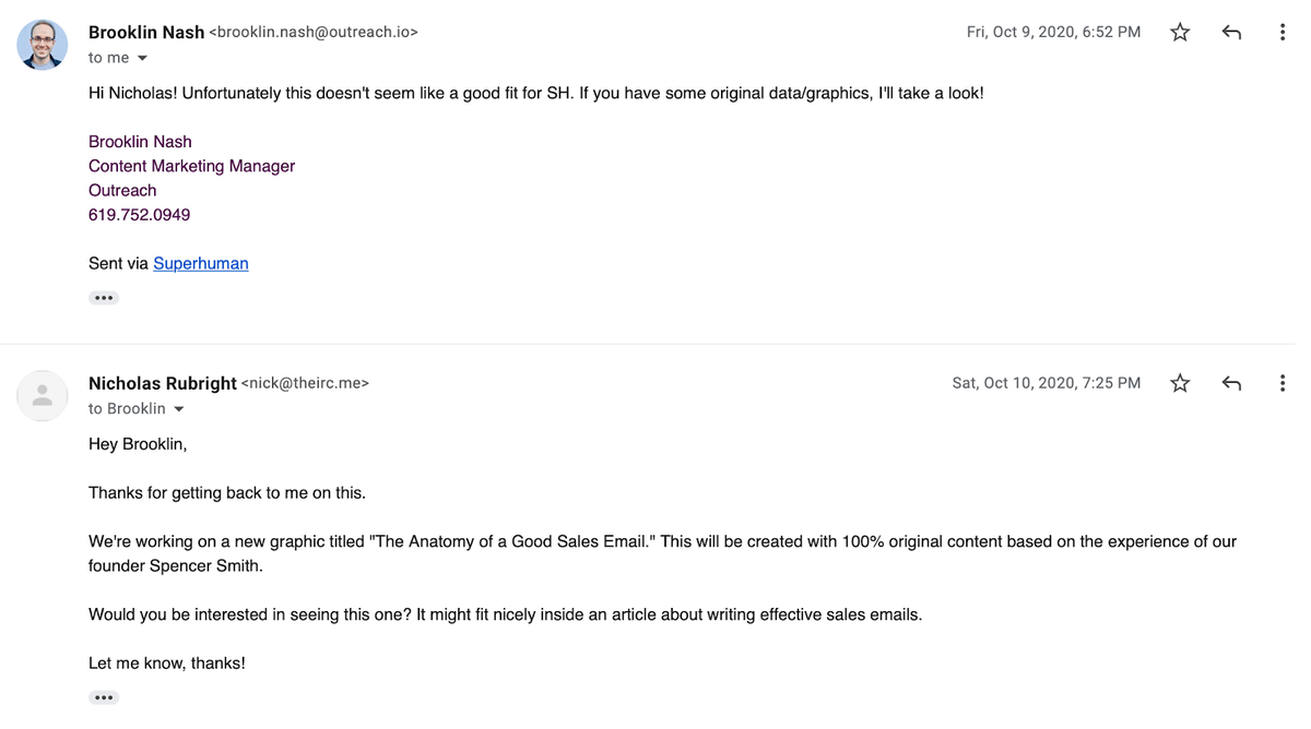 This simple approach is what helped us get in contact with editors at high DR sites, like Brooklin Nash when he was with SalesHacker: