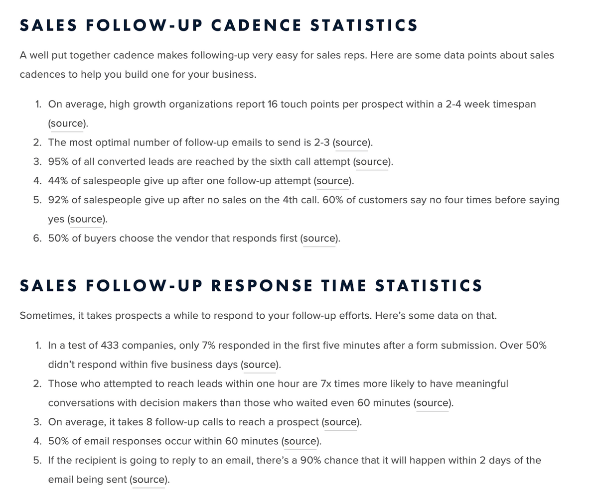 To start, we gathered a list of the most linked-to sales statistics and picked out the ones that were commonly talked about in the context of follow-ups.