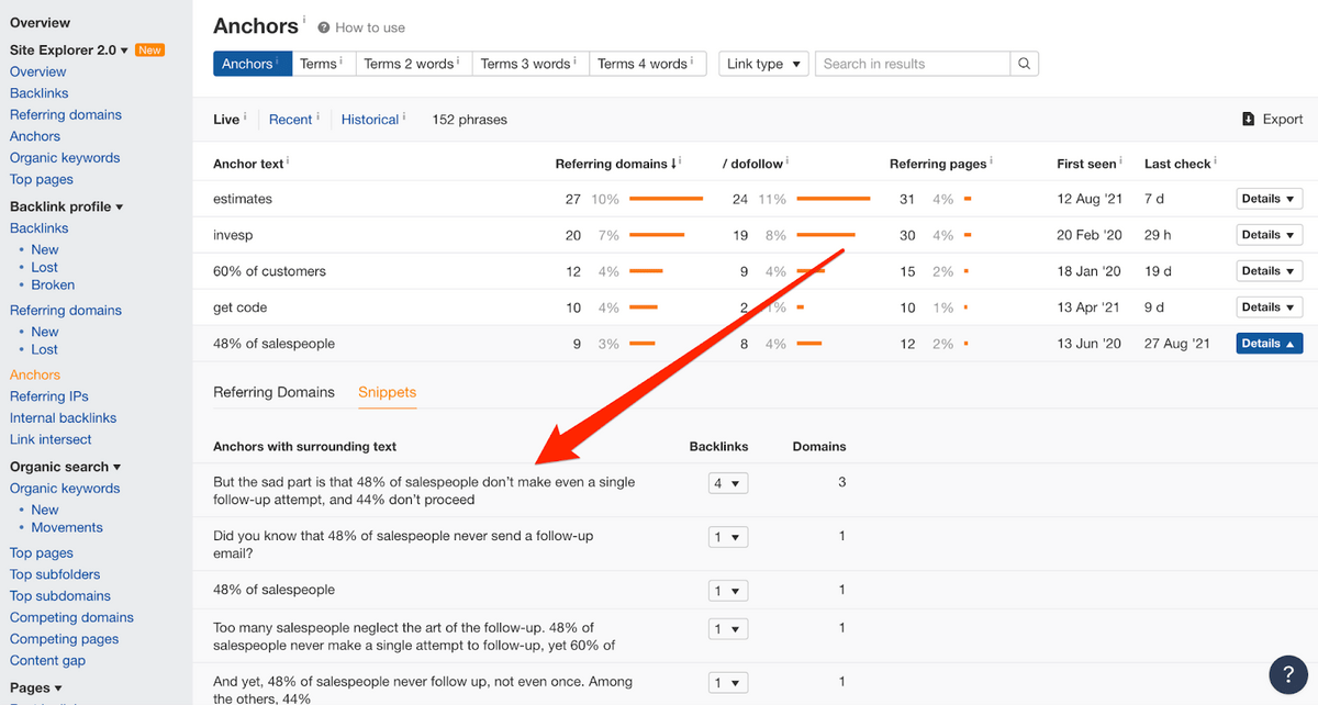 When examining our outbound linking behavior, we saw that people link with brand names, stats, and descriptive anchors as opposed to keyword-driven ones. We can combine this info with the anchor text data available in Ahrefs to draw conclusions about natural linking behaviors.
